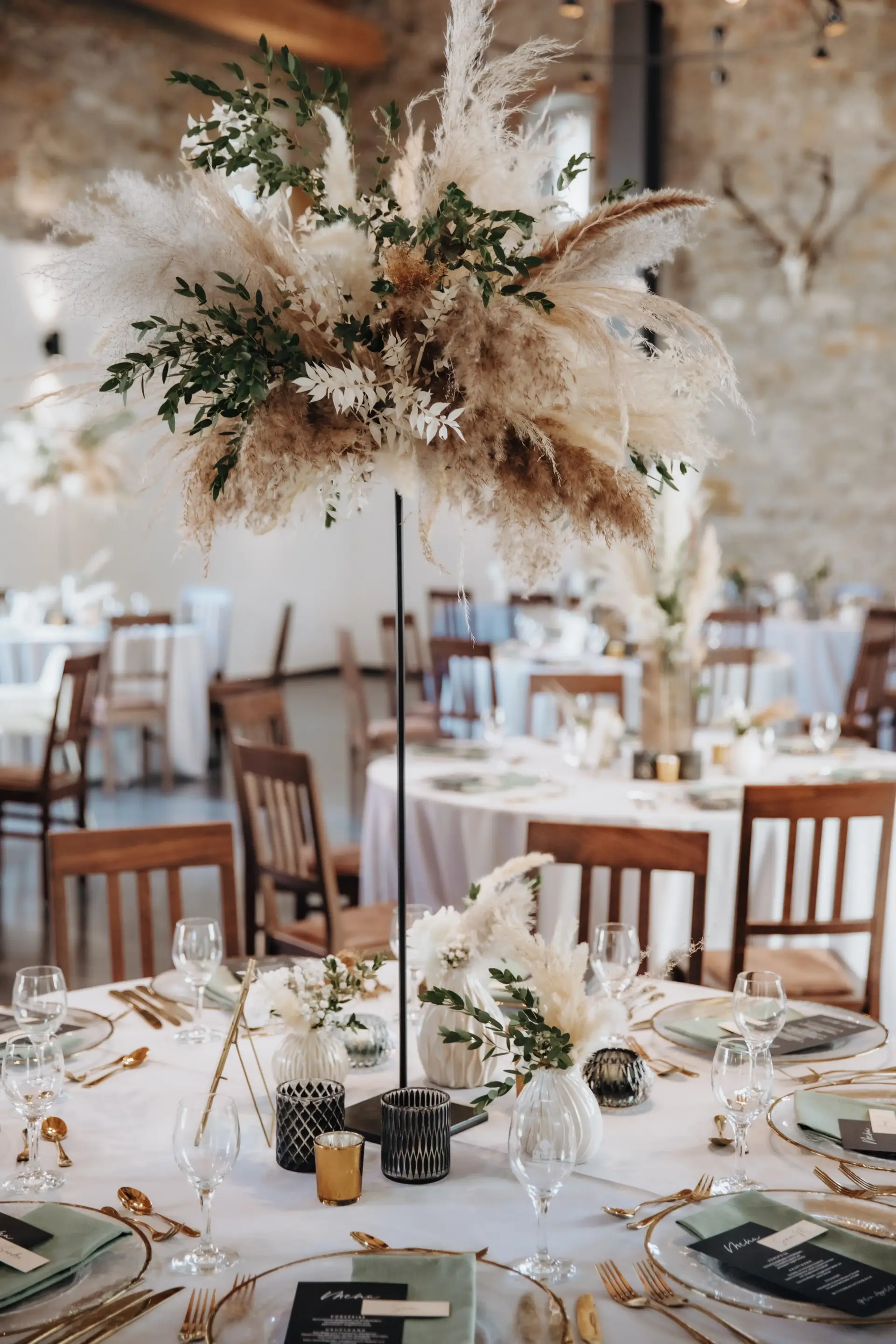 Eine Trauung in der freien Natur, umgeben von majestätischen Bäumen, saftigem Gras und einer Boho-Hochzeitsdekoration, die Freiheit und Natürlichkeit ausstrahlt. Bei uns habt ihr die Möglichkeit, eure Liebe zu Pampasgras und Trockenblumen in einer einzigartigen Hochzeitslocation zu verwirklichen.